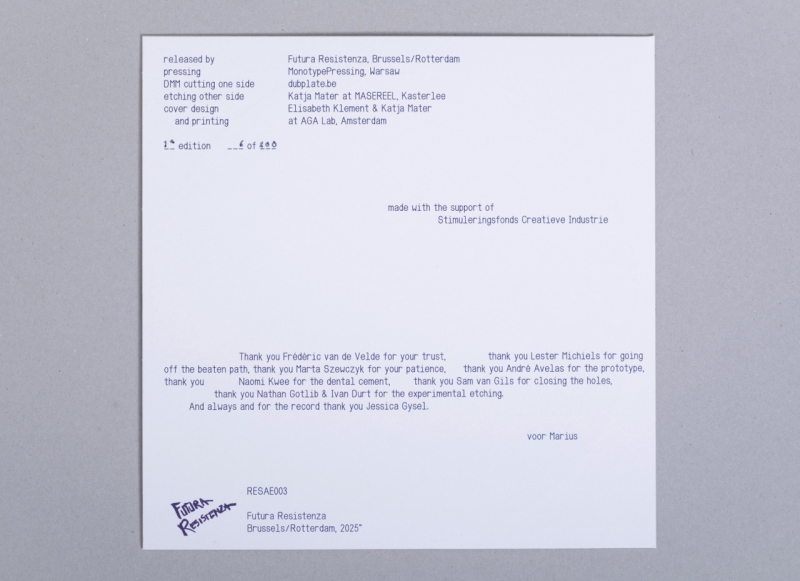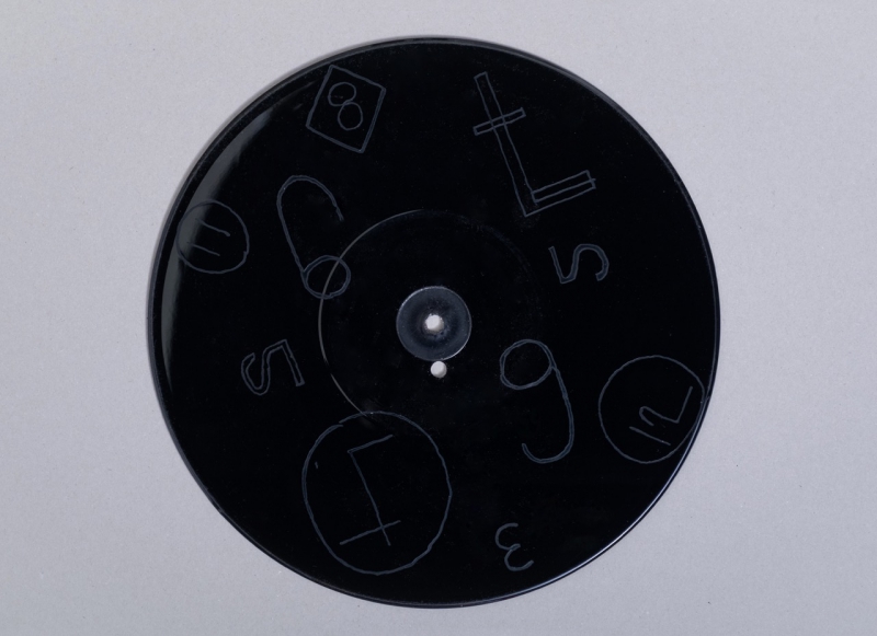 Side B reimagines the record as an image carrier. Instead of audio, Mater etched a drawing directly into the copper layer of a DMM master plate, turning a clock-like image into an analogue tactile imprint. When played, the record’s rotation animates this clock drawing, however not arms, but faces turn.